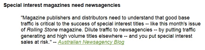 Magazine publishers and distributors need to understand that good base traffic is critical to the success of special interest titles – like this month’s issue of Rolling Stone magazine. Dilute traffic to newsagencies -by putting traffic generating and high volume titles elsewhere – and you put special interest sales at risk.