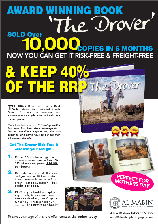 Alice Mabin’s book, The Drover, is doing stellar business for Australian newsagents after bookshops rejected it. I have it in my newsagencies – it’s an excellent book. Some customers are buying it for the history. Others buy it as a gift.