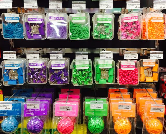 Check out the colour blocking of stationery that I saw at a newsagency-like Whitcoulls store in New Zealand earning this week. It looks good, very appealing. Their clever buying and in-store colour blocking helps them position paper clips, bulldog clips and rubber bands differently to what we see in the average Australian newsagency. This approach appeals to a broader audience.