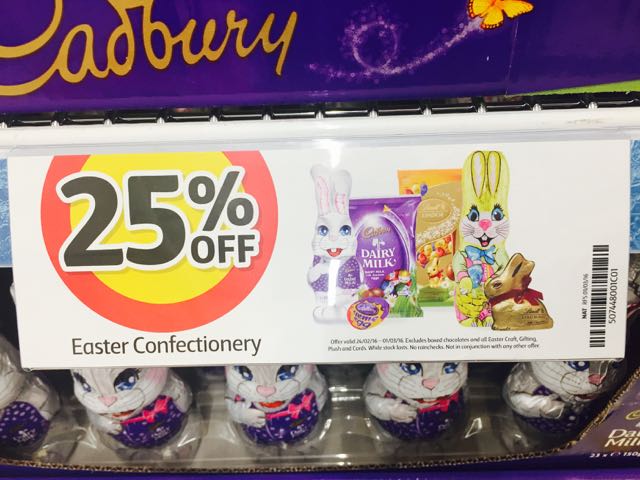 IMG_7195Coles is promoting Easter confectionery at 25% off in-store on in the media, trashing the margin opportunity for other retailers, especially small business retailers who can’t strong-arm suppliers to discount to allow 25% off retail to be profitable.