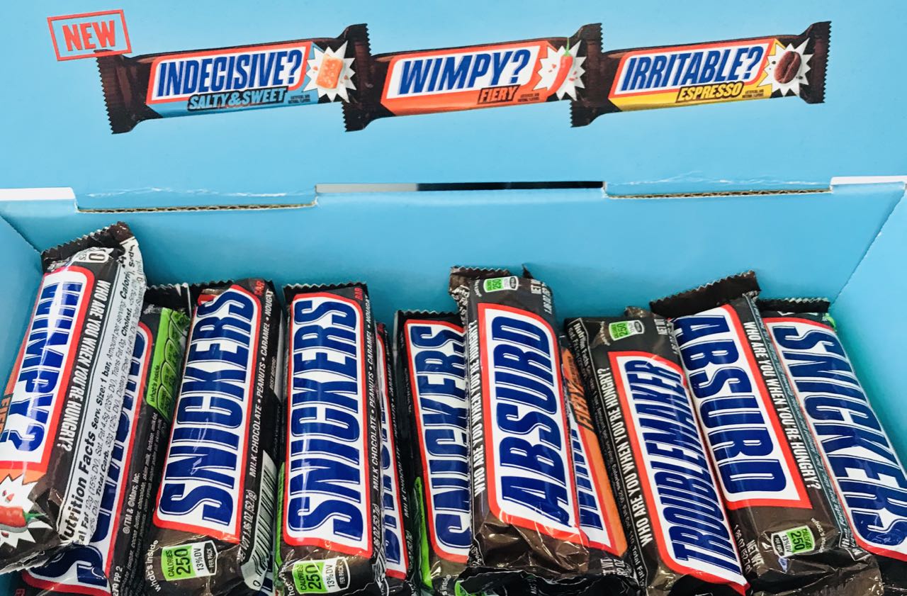 Mars is embracing temporary re-naming os Snickers like plenty of other food companies to give shoppers an additional reason to purchase. A Snickers bar labelled as a chocolate bar called Absurd turns the Snickers into a fun gift for someone, thereby expanding the reach of their product.