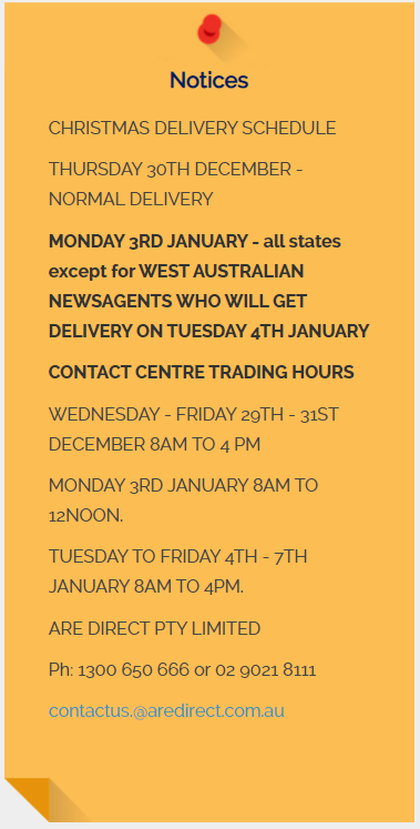 We will provide your store with A3 and A4 poster to display to your customers your new delivery date for magazines. This will arrive with your first consolidated delivery. We would also ask if you could also communicate the change to your regular weekly magazine customers in advance of the change in on-sale delivery. This should include the weekly Are Media titles That’s Life and Take 5 that will now be delivered earlier.