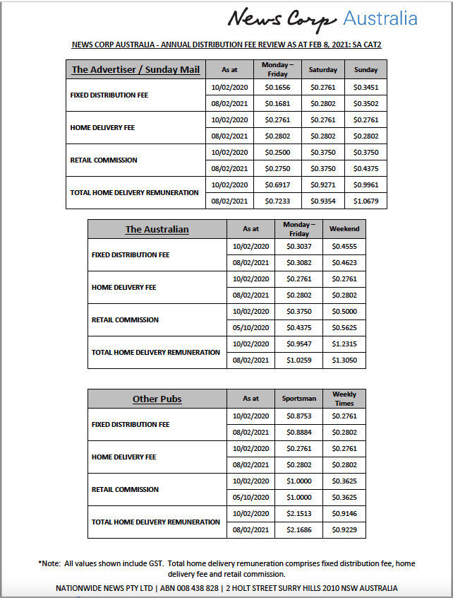 - A flat insert or giveaway fee for each time the newsagent is asked to give something away with the newspaper where the fee is at least 10% of the cover price of the accompanying newspaper and is paid weekly as an automated credit to the account.