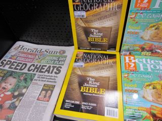 Thanks to a comment here by h, I moved copies of the latest National Geographic magazine from its usual location to our newspaper stand. I appreciate the tip and agree that the cover story about the King James Bible is sure to drive some impulse purchases. I am excited to see what happens … it’s always good to see a sales lift from a cover on a title like National Geographic.