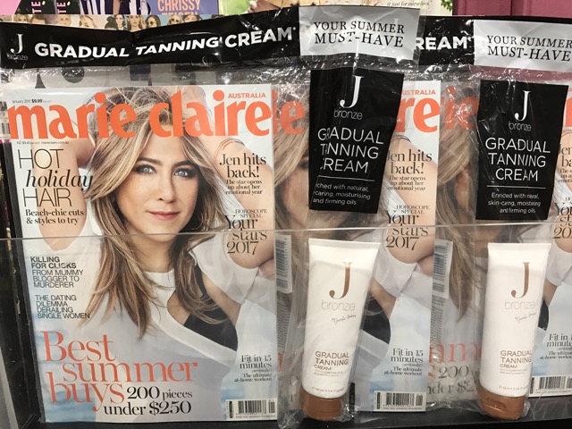IMG_2347We have all but sold out of Marie Claire magazine thanks to the terrific J Bronze tanning cream gift with purchase and that this gift was not widely available. We leveraged the opportunity with out of store marketing and it worked a treat. Our main magazine competition is the two Coles’ in the centre and they did not have this gift with purchase.