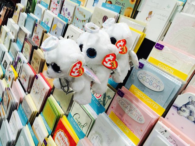 Check out how a clever and handy team member integrated plush with cards. Using a $4.00 stand for a hair-straightener they created a platform onto which to place these Ty Halo Beanie Boos that are appropriate to Baptism, Confirmation, Holy Communion cards.