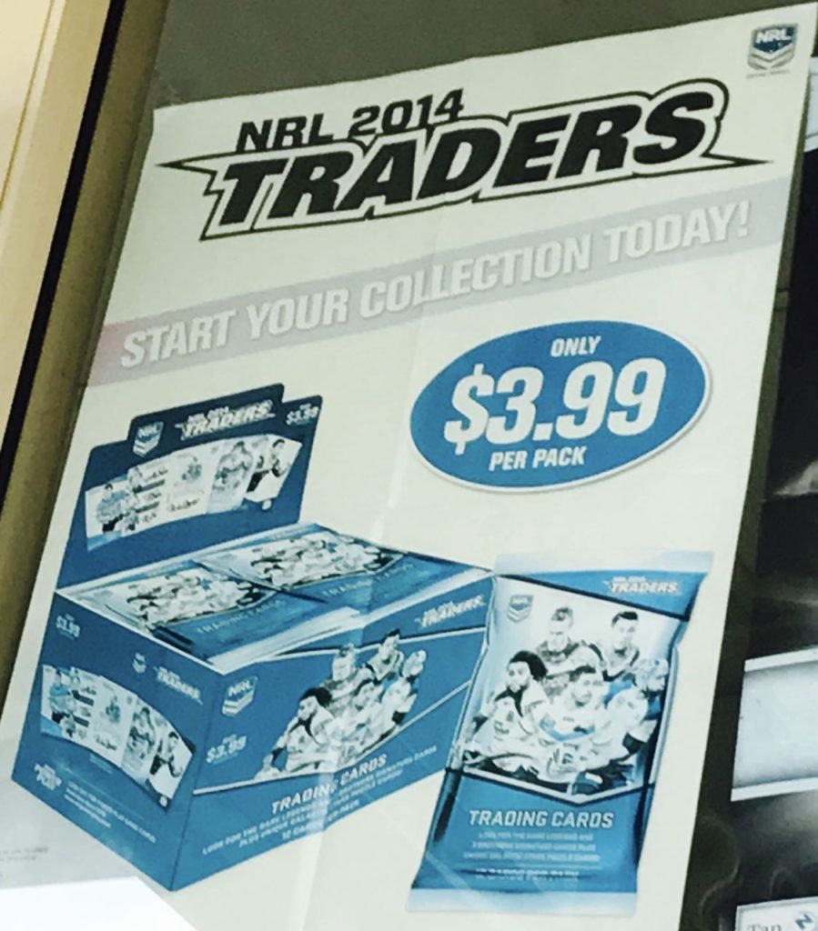 Here are three photos from the outside of a newsagency I saw on the weekend. Magazine returns for $2.00. Old-school magazine stickers that make newsagents look bad. A NRL poster from 2014. Shocking.