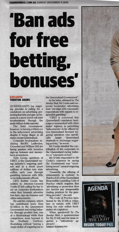 The Courier Mail yesterday had this story about concerns regarding free betting offered as part of marketing. This story appears to be a result of agitation by Tatts on the issue – if you read the article.