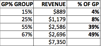 Reading across the table, next to each GP band label is the revenue for that band and the percentage of total GP earned by the products in that band.