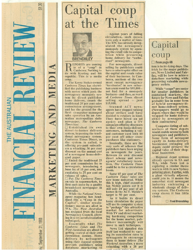 While more recent changes have come about because of worldwide disruption to the print media model, the bigger changes began in the late 1990s when the Howard federal government took away protection for local small business newsagents, protection put in place by the federal government, in support of big business mates in supermarkets and a national convenience store chain.
