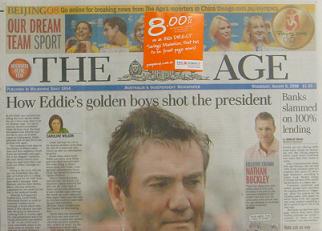 age_aug608.JPGThere is no doubt that the ad for ING stuck over the masthead on The Age newspaper today looks stunning.  You see this before the headline about Eddie Maguire – almost sacrilege in Melbourne.  The advertiser would be very happy as would the advertising department at The Age.  I love newspapers and wish that newspaper professionals inside The Age had the strength to stop ads being stuck over editorial content or, worse still, the newspaper masthead.
